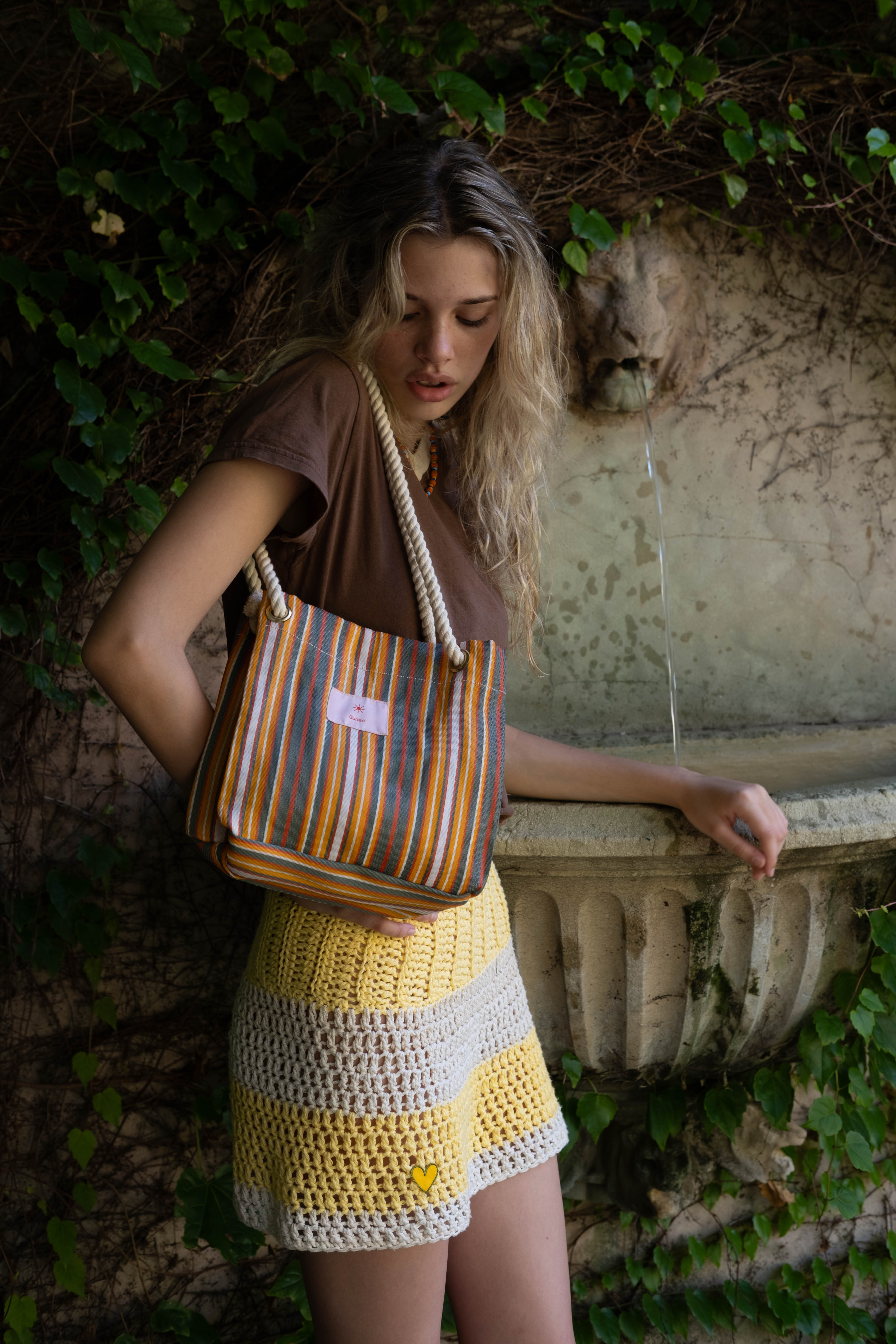 Our bags are made from recycled nylon, including materials like fishing nets, old carpets, and manufacturing off-cuts. Each one is unique, both in look and texture.